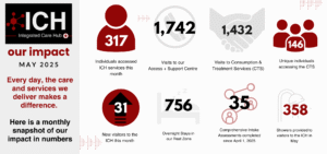 - ICH Impacts: May 2025Programs and services at the Integrated Care Hub make an impact on our community every day. Take a look at our service statistics for May 2025 below, and visit Our Impacts for this information, updated monthly. 317 unique individuals accessed ICH services in May 2025 There were 1,742 visits to our Access & Support Centre in May 2025 There were 1,432 visits to the Consumption & Treatment Service… Read more: ICH Impacts: May 2025